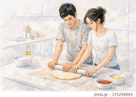 朝のキッチンでピザ生地を一緒に伸ばす日本人カップル