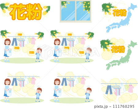 杉花粉_洗濯物を干しながら困った表情の親子_杉の花_花粉文字入り