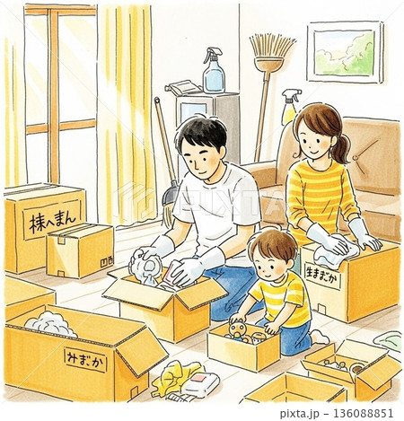 部屋を掃除する家族