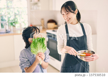 キッチンで料理をする親子