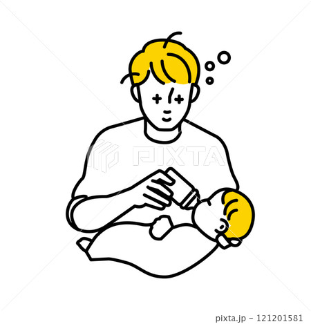 困った表情で赤ちゃんにミルクをあげている父親の手描きイラスト