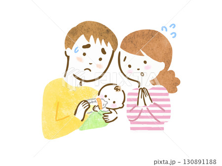 赤ちゃんの授乳がうまくいかずに焦っている夫婦の手描きイラスト