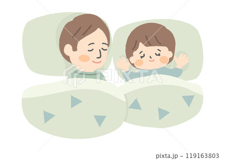 一緒の布団で子どもの寝かしつけをするトリケラトプスのイラスト