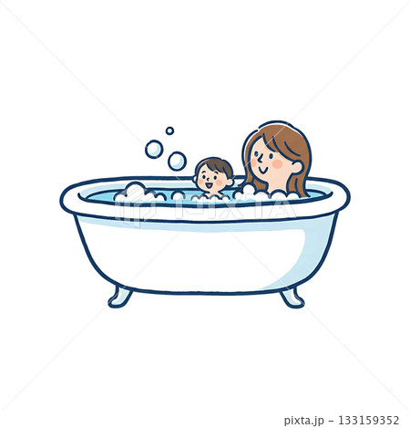 お風呂に入っている母親と娘の手描きイラスト