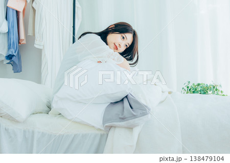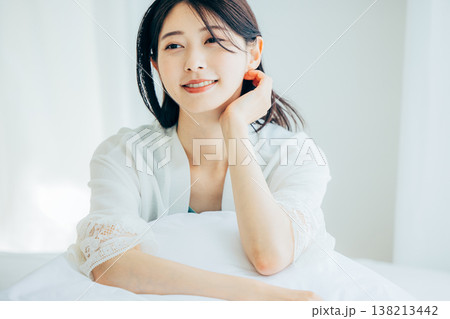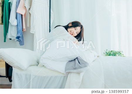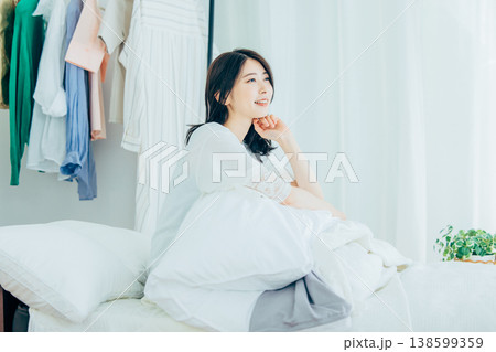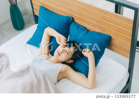 朝のストレッチ 寝室で伸びをする女性 モーニングルーティン 余白あり