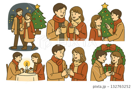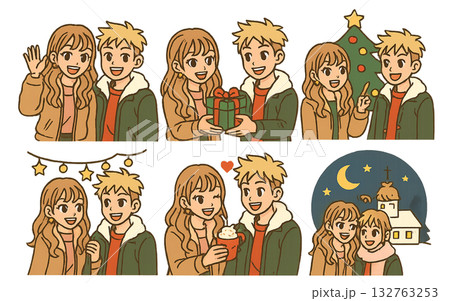 冬の街を歩きながら会話するカップルのベクターイラスト素材 クリスマスのプレゼントを買う男女