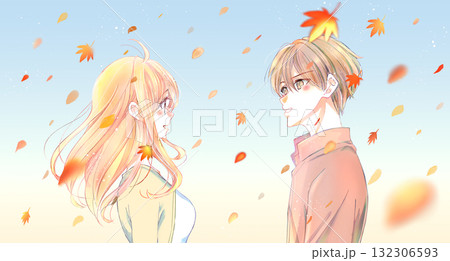 落ち葉が舞う並木道(イチョウ並木)をカップルが手をつないで歩く姿