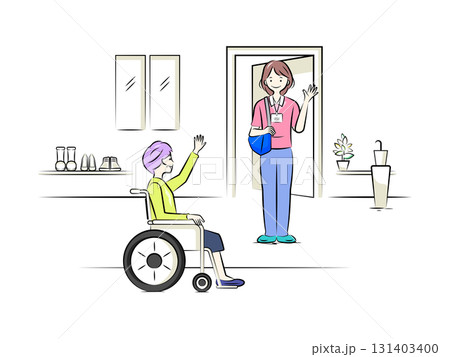 高齢者の自宅を訪問した女性訪問看護師のイラスト