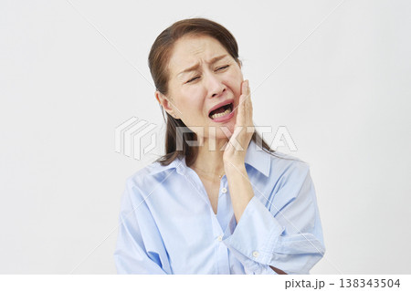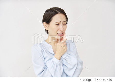 白背景で歯痛に悩む女性