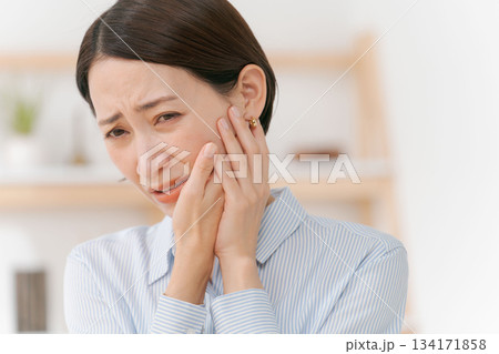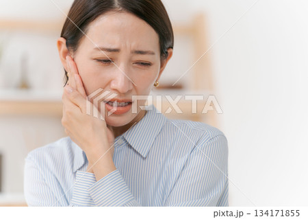 痛む顎を押さえる女性