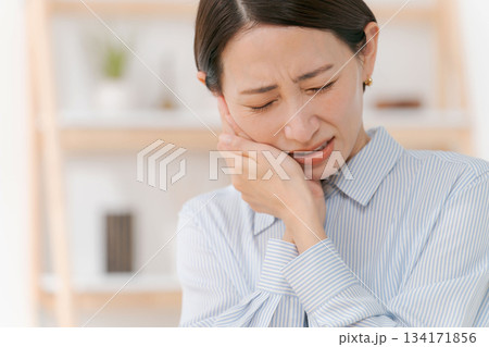 歯が痛いシニア女性 リビングルーム