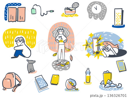 孤独やSNS疲れを感じる若者の日常と心の葛藤を描いたメンタルヘルス・孤立対策イラストセット