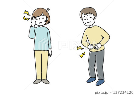 頭痛の女性と腹痛の男性のイラスト