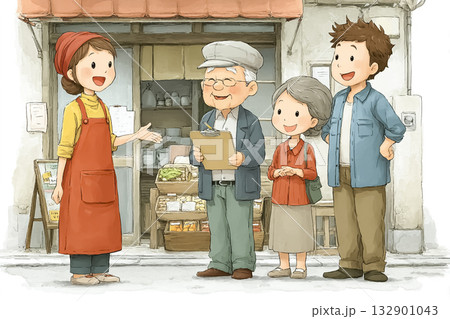 美優シリーズ:美優が高齢者と市場で会話しながら買い物しているシーン