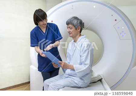 CT検査 スタッフの説明を受けるシニア男性