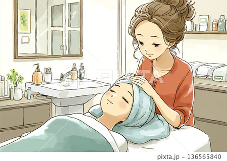 エステサロンでフェイシャルケアを受ける女性と施術者のイラスト素材