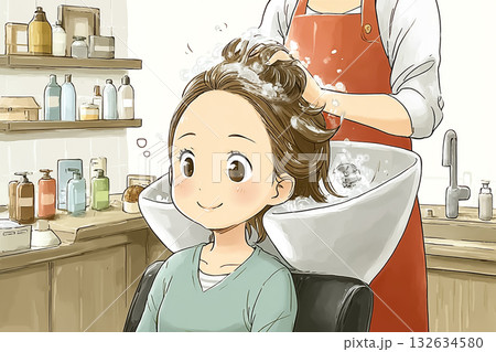 髪の毛をカットしてもらうカットモデルの女性のイラスト素材