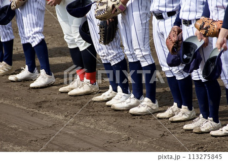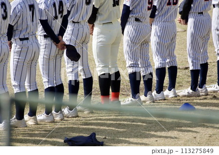 高校野球の試合に勝ち校歌が流れる時に整列している選手たち