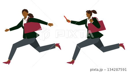 ビジネスのバトンパスをする走る黒人系女性ビジネスマンのイラスト|事業継承・仕事の引き継ぎ