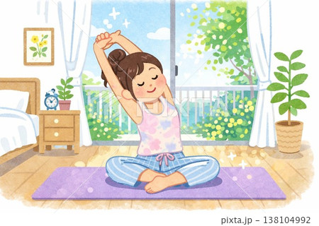 朝にリビングでストレッチで伸びをしているをする女性のイラスト1