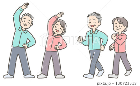 脇腹を伸ばすストレッチをする高齢男女イラストセット