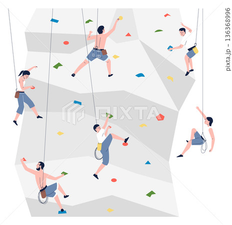 Extreme people. Rock climbers. Men and women climb wall with colored hooks. Height lifting with safety ropes. Athletes training. Artificial stones. Mountaineering gym. Vector concept