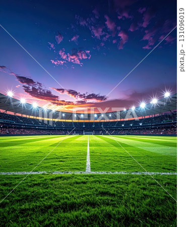 夕暮れのスタジアムと緑の芝が広がるサッカー試合の臨場感ある風景