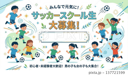 サッカースクール生徒募集のバナー・チラシ用イラストテンプレート(笑顔で楽しむ子供たち)