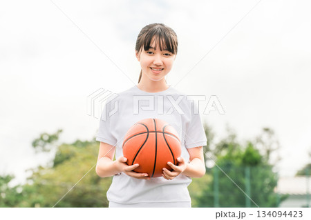 バスケットボールを持っている笑顔の女子中学生・女子高生