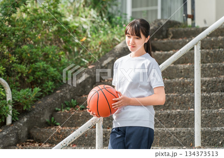 校舎の前でバスケットボールを持つ女子中学生・女子高生(部活・スポーツ・運動部・バスケ部)