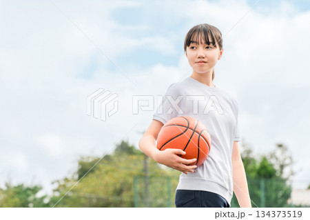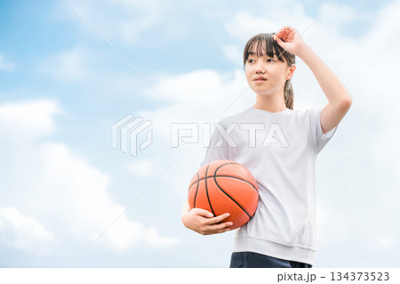 青空の中でバスケットボールを持つ女子中学生・女子高生(部活・スポーツ・運動部・バスケ部)