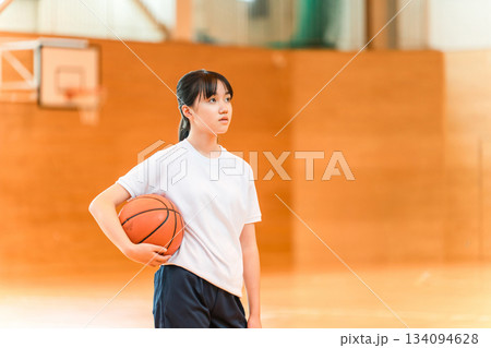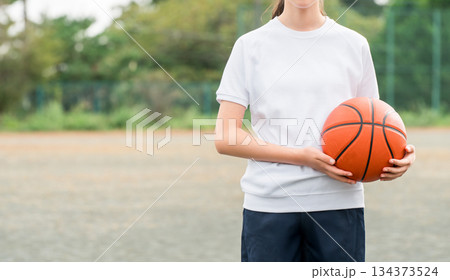 体操服,運動服を着てバスケットボールを持つ小学生,中学生,高校生の女の子,子供