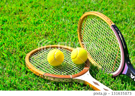 Tennis banner. Sport composition with yellow tennis balls and rackets on a green background with copy space