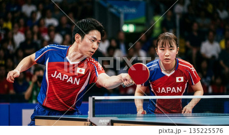 混合ダブルスの卓球の試合をする選手