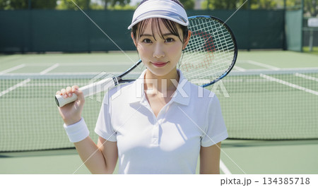 テニスコートに立つ女性テニスプレーヤーのイメージ素材