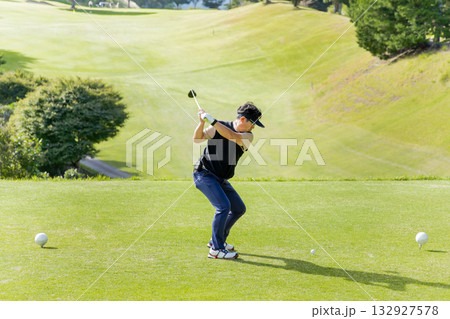 ゴルフ場でゴルフをするゴルファーの女性(ティーショット・ゴルフコンペ)