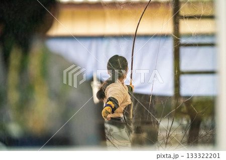 着物を着た通し矢を待つ女性 三十三間堂にて