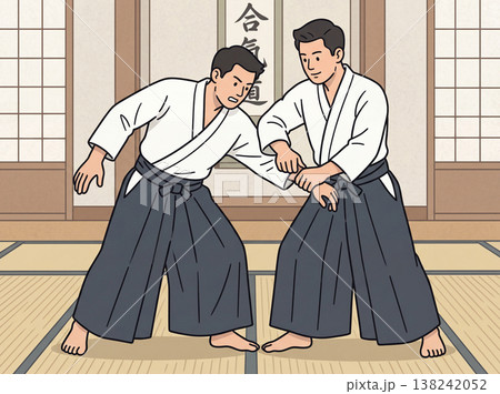 Illustration of two men practicing Aikido in a Doj