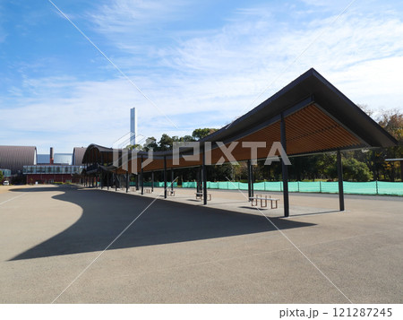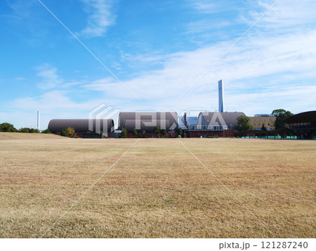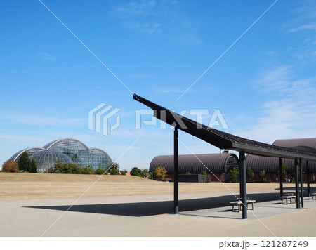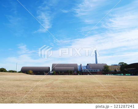 青空に映えるガラスドームとアーチェリー場|夢の島公園