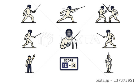 フェンシングの技と試合アイコンセット9種|突き・構え・対戦・面・審判・スコアボード・武道アイコンシリ
