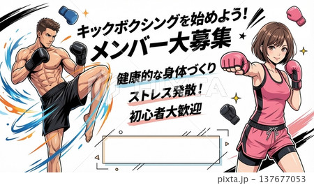 キックボクシングメンバー募集バナー背景素材 初心者大歓迎 楽しく強くなる イラスト 集合