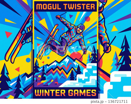 モーグルスキーヤーのエアリアル。レトロでカラフルなポップアート風ポスターイラスト(幾何学模様と雪山)