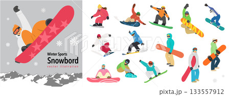 雪山を颯爽と滑走するスノーボーダーのイラスト素材