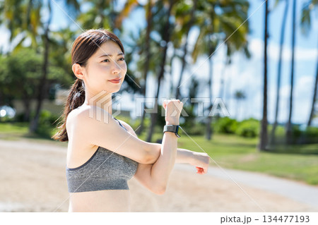 疲れて休憩する女性 疲労 ジムで運動するかっこいい女性 筋トレ女子 トリミングアップ