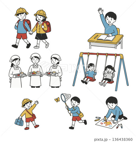 春の園生活と遊び!笑顔の保育士と園児のイラストセット 園だよりや入園募集に最適