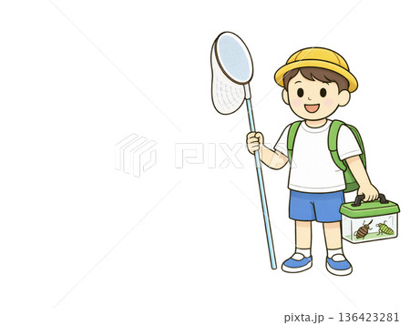 虫取り網と虫かごを持った元気な男の子のイラスト