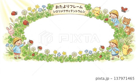 シロツメクサとテントウムシ(野原を囲むような楕円形フレーム)