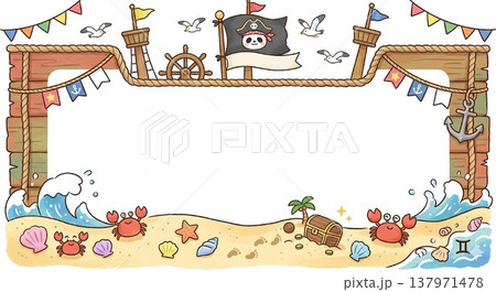 カニ・貝殻・波のしぶき(下部に砂浜と海の生き物を置いた海賊船風フレーム)