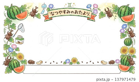 スイカとカブトムシ・クワガタ(虫取り網などを添えた、夏休みのお便り用フレーム)