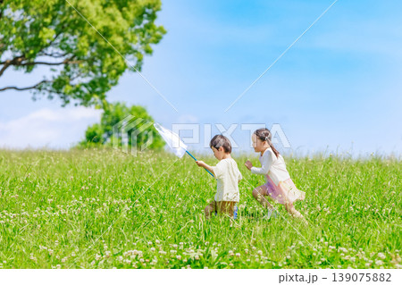 青空の草原で走り回って遊ぶ子供達